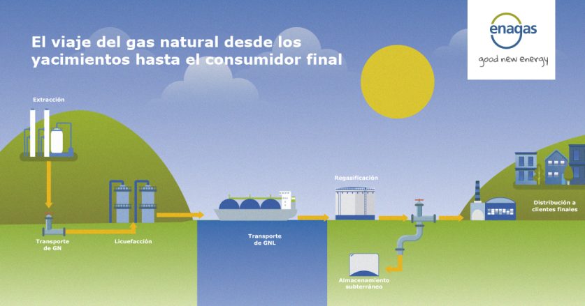 El principal componente del gas natural es el metano, que tiene un punto de ebullición a presión atmosférica cercano a los -160 º C. Por tanto, su licuefacción se consigue enfriando el gas natural a esa temperatura a presión atmosférica. Este proceso se realiza en plantas de licuefacción en los países productores de gas natural. Allí es licuado y cargado en metaneros con destino a los distintos países en los que está previsto su consumo, como por ejemplo España. Nuestro país, que ha recibido, en lo que llevamos de 2020 un 69% de su gas en forma de GNL, cuenta con siete plantas de regasificación en las que se recibe ese GNL y lo devuelve a su estado gaseoso para su posterior inyección en red. También en forma de GNL, el gas puede ser cargado en camiones cisterna o incluso ser recargado en otros buques para su reexportación.
